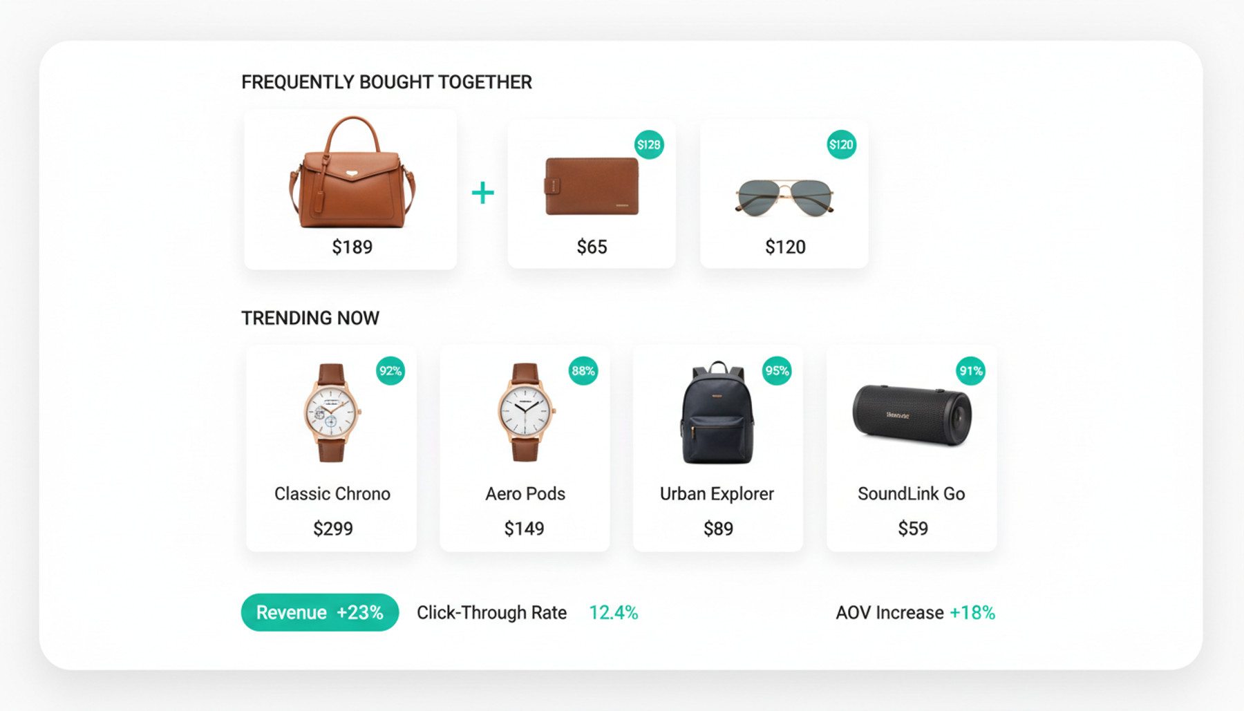 AI-powered product suggestions including frequently bought together, trending items, and personalized picks that lift AOV.