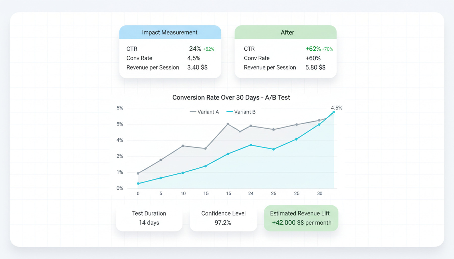 Before-and-after comparisons, A/B test tracking, and trend analysis give you confidence that every optimization is delivering results. See exactly how synonym rules, ranking changes, and merchandising updates affect revenue and engagement.