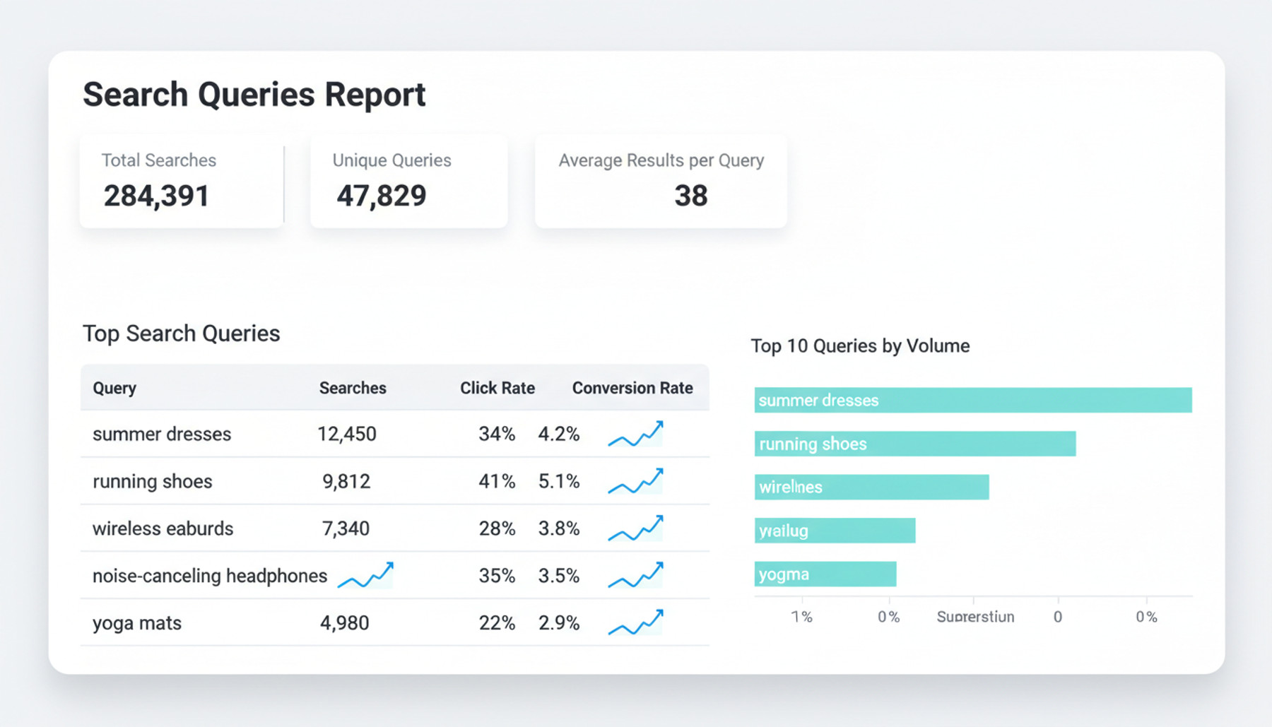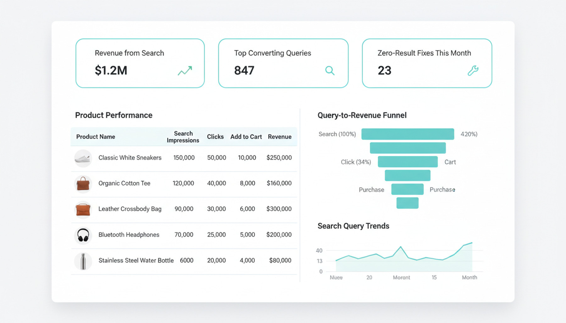 Correlate search queries with click-through behavior to see which results earn engagement and which get ignored. Use these insights to fine-tune ranking logic, improve product imagery, and surface the right items at the right time.