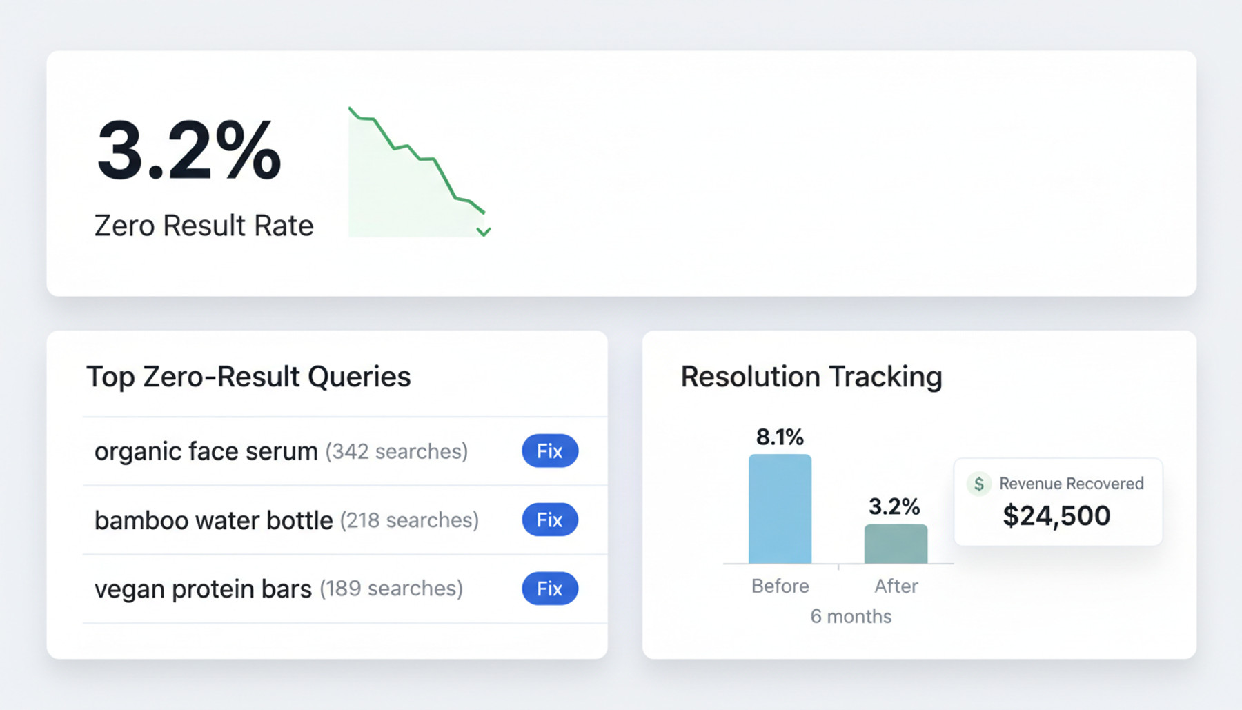 With real-time dashboards, AI-powered recommendations, and full-funnel visibility from query to checkout, your team can act on insights the moment they appear. Fix zero-result searches before they cost you revenue, optimize rankings with confidence, and measure the impact of every change.