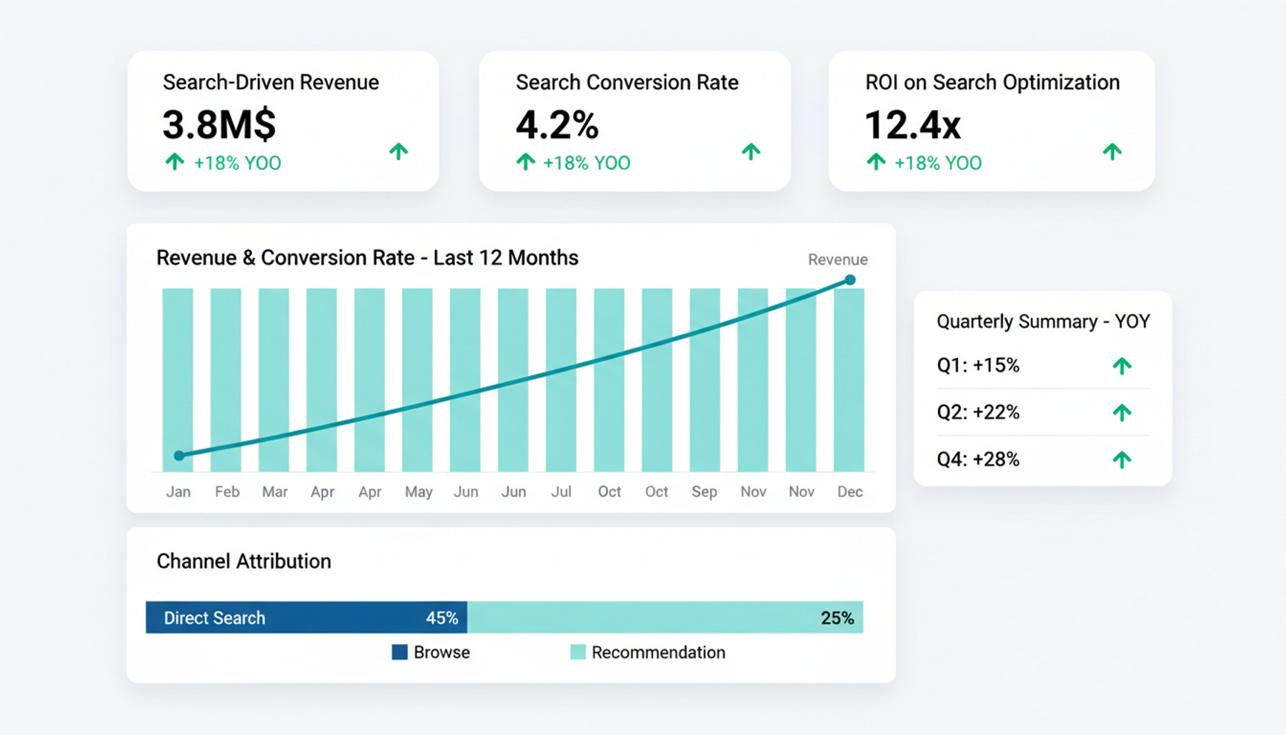 Track search-driven revenue, measure ROI on optimization efforts, and report on discovery KPIs with executive-level dashboards that connect search performance to business outcomes.