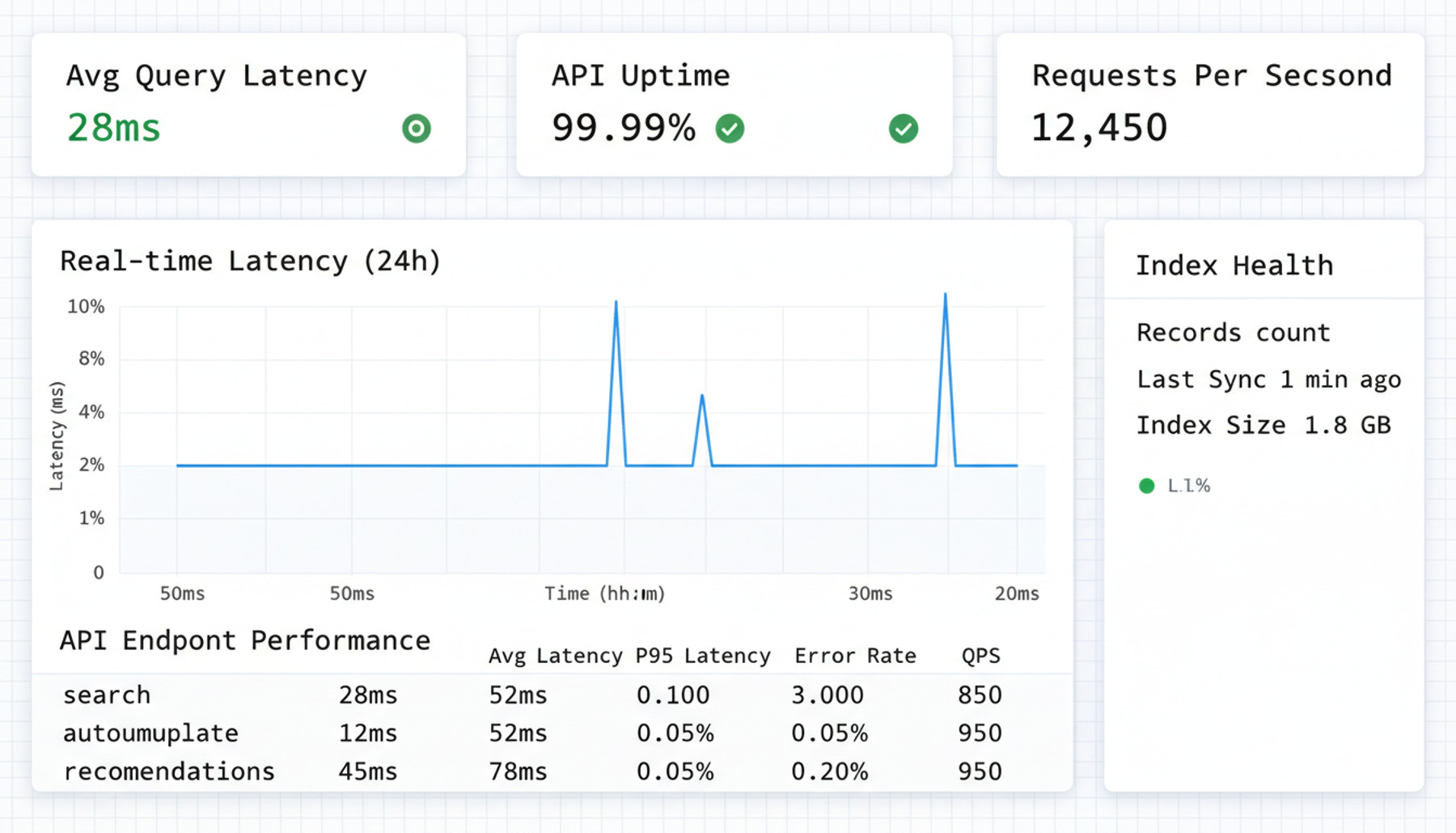 Monitor query latency, track API performance, and debug relevance issues with granular search data. Engineering teams get the metrics they need to keep search fast and reliable.