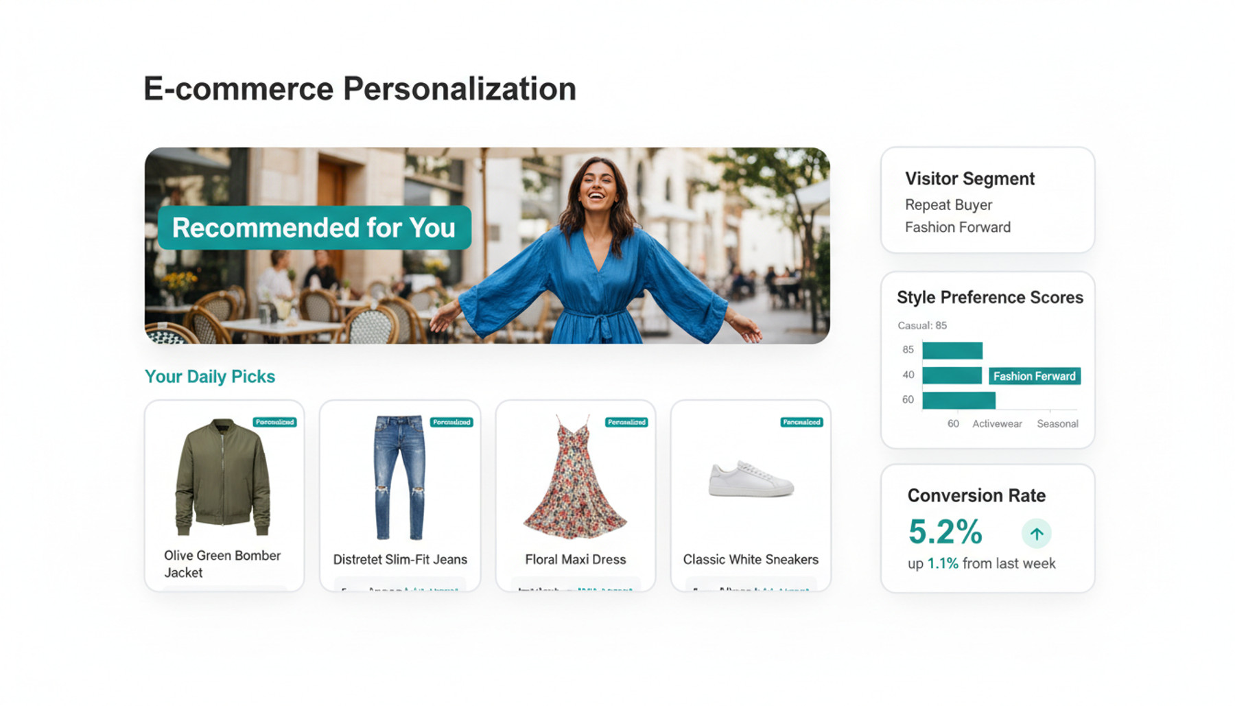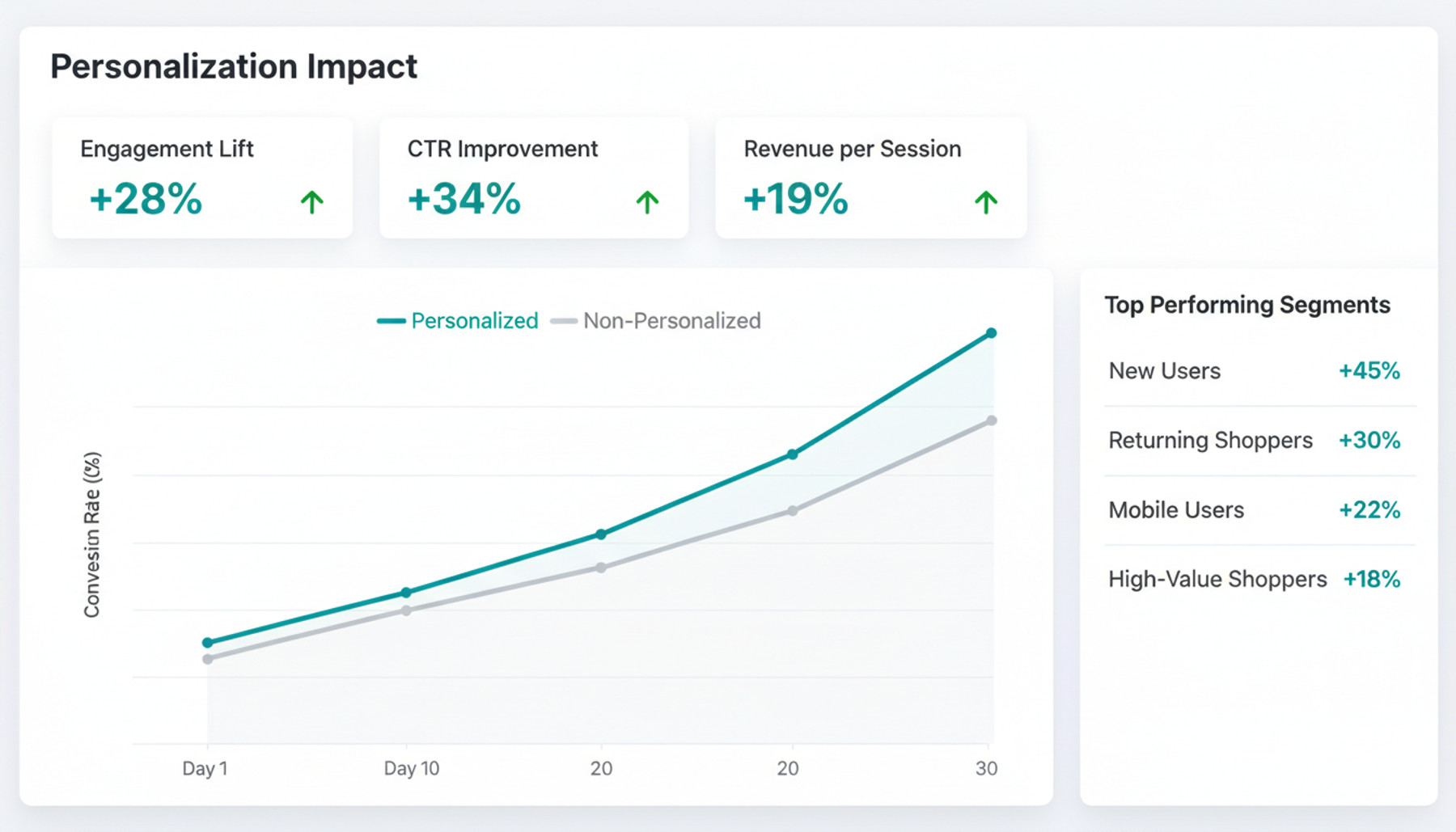 Built-in A/B testing and analytics let you compare personalization strategies, track engagement lift, and iterate. Dashboards show exactly how personalization impacts click-through rates, conversion, and revenue.
