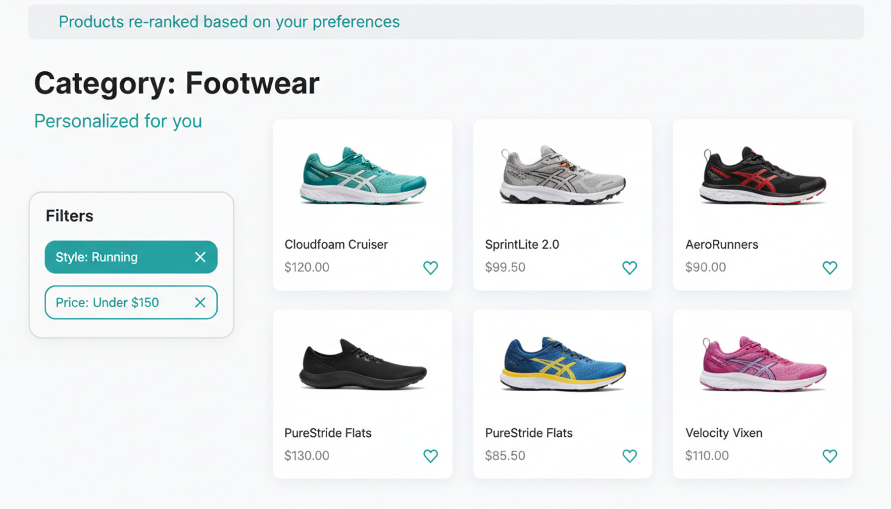 Category pages automatically re-order products to match individual preferences. Visitors browsing footwear see their preferred brands and styles first, while new visitors see trending and popular items to guide discovery.