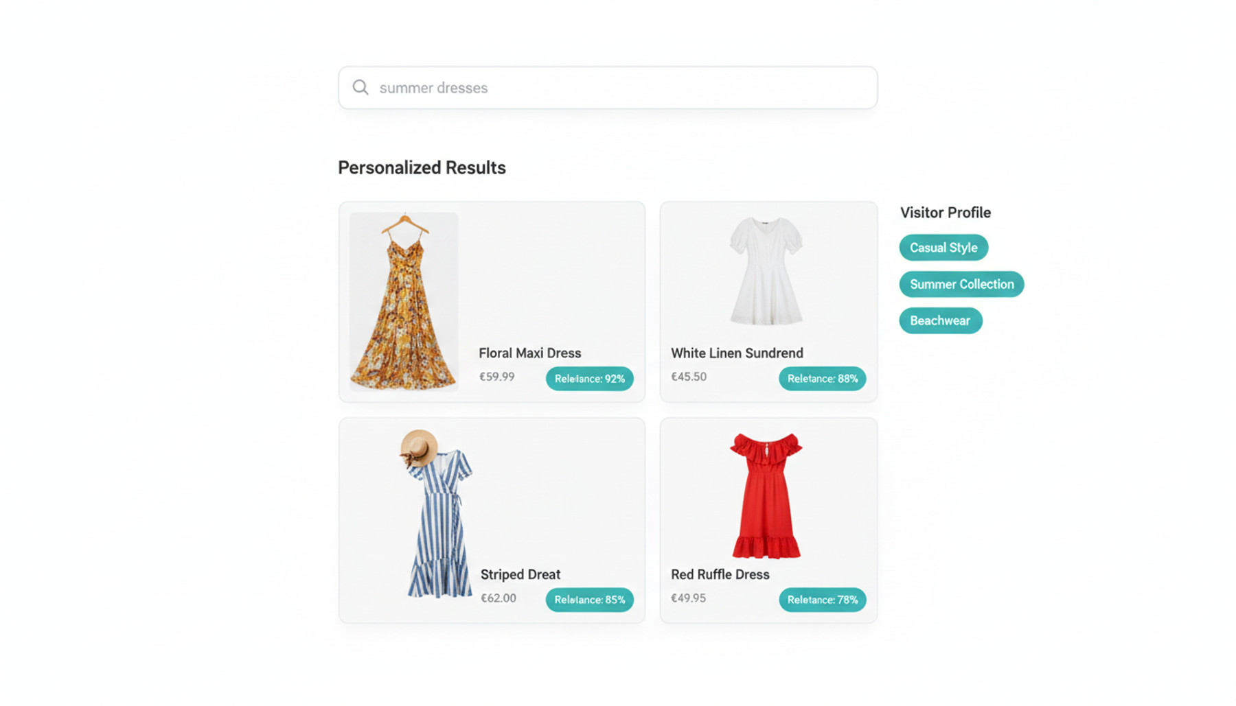 Re-rank search results by shopper affinity, personalize homepage carousels, and tailor category pages so every visitor sees products aligned with their style, size, and price preferences.