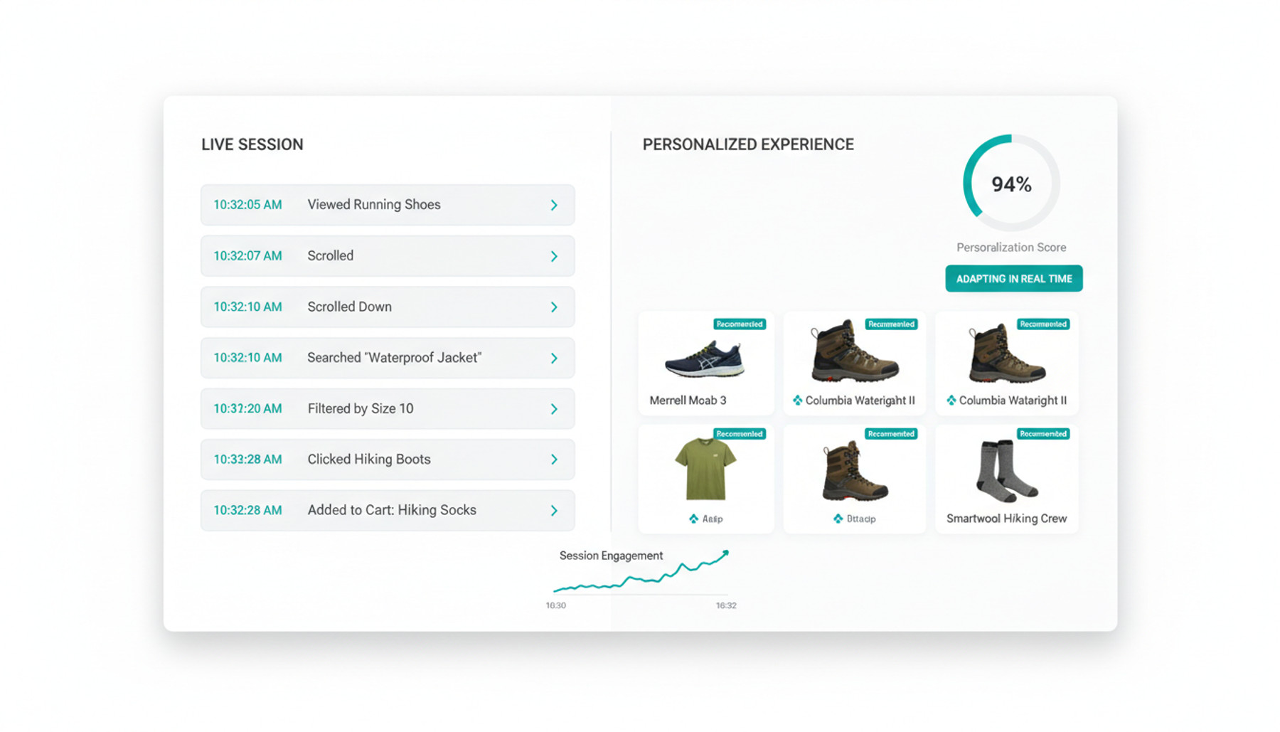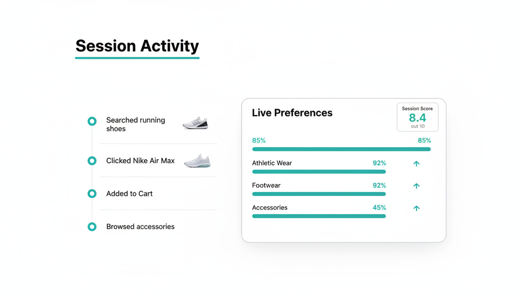Every click, search, and page view within a session feeds into real-time preference detection. The experience evolves as the visitor browses, responding to immediate intent signals rather than relying solely on historical data.