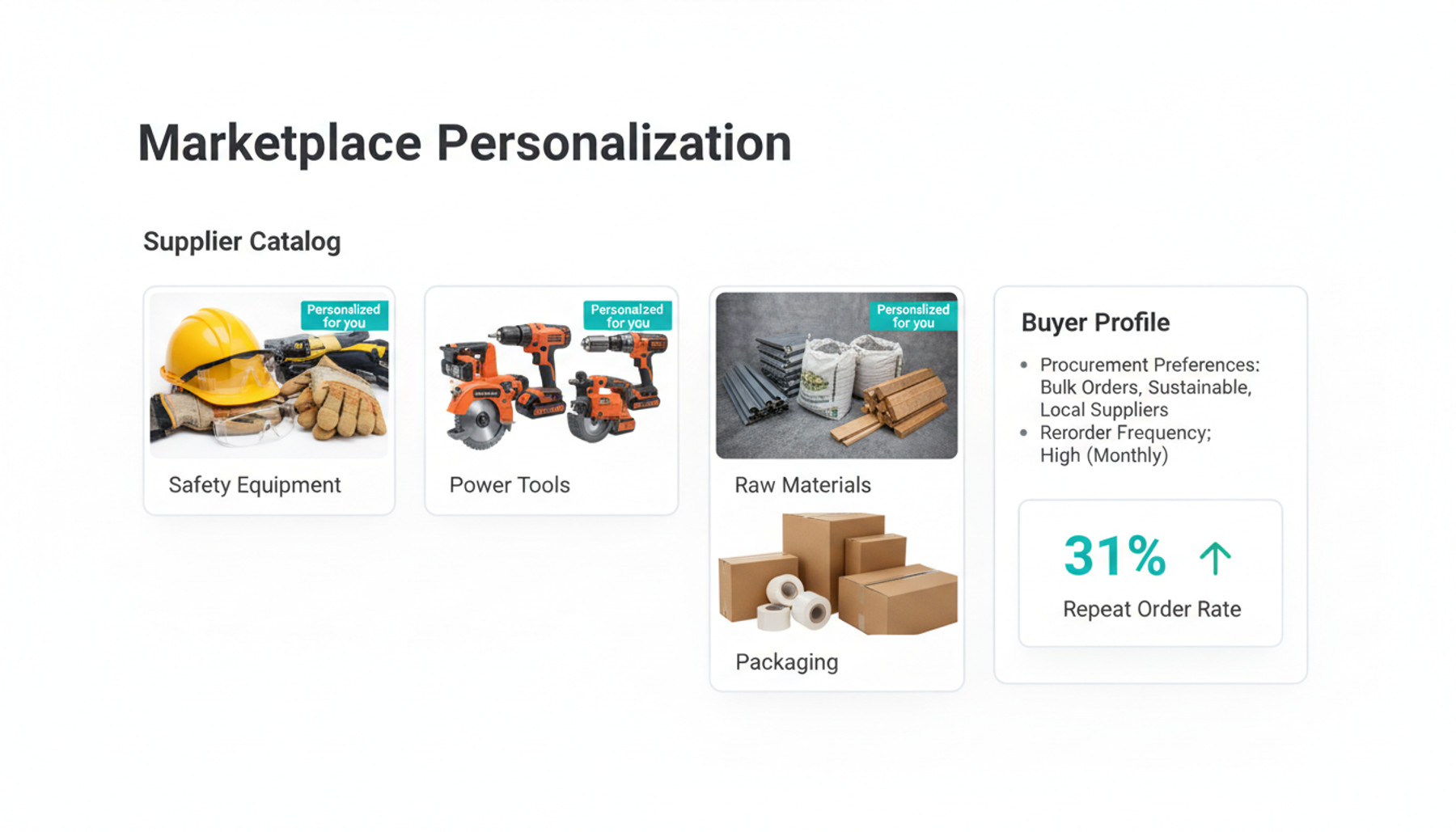 Personalize supplier catalogs, reorder suggestions, and procurement search results based on each buyer's purchasing history, preferred vendors, and industry vertical.