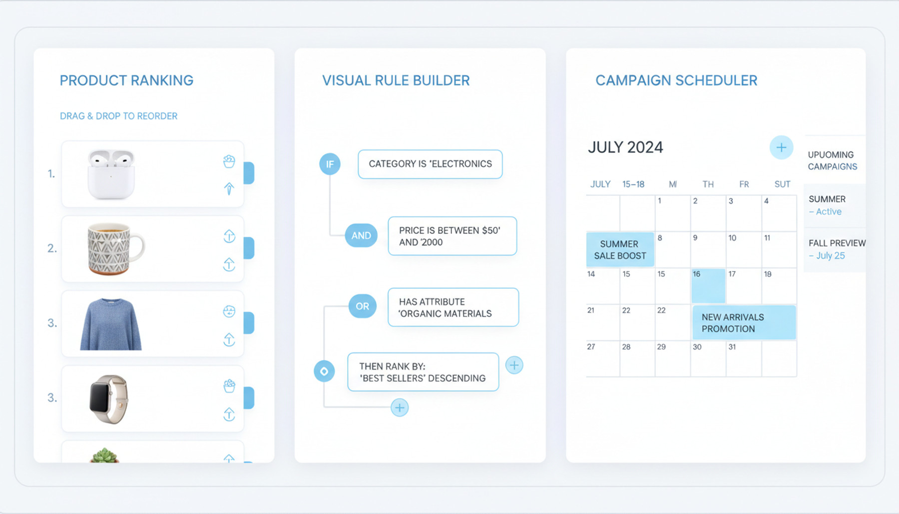Define sophisticated global or category-specific rules. Automatically prioritize products based on attributes like brand, color, price point, or seasonal relevance.