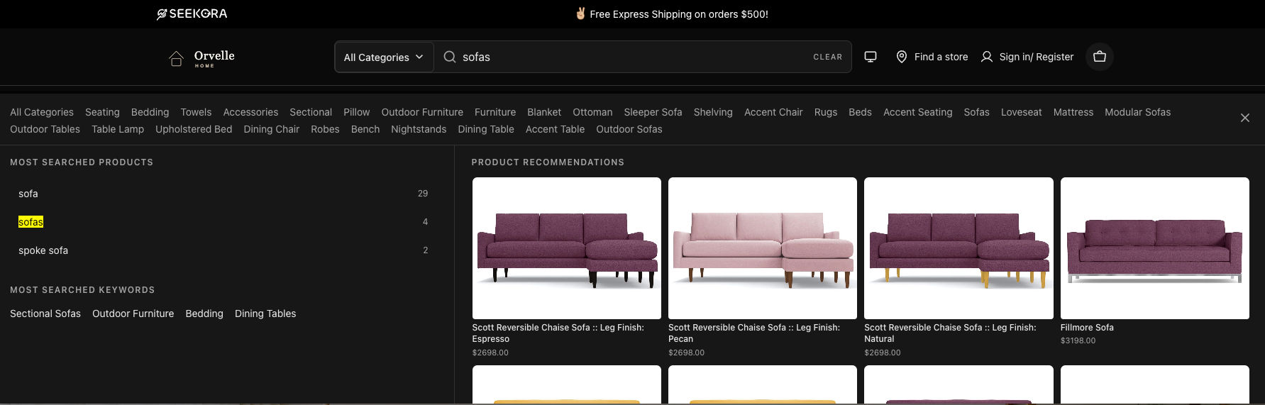 Seekora indexes products with style attributes like "mid-century modern", "Scandinavian", "industrial", and "boho". Search results and browse pages automatically organize around these style categories.