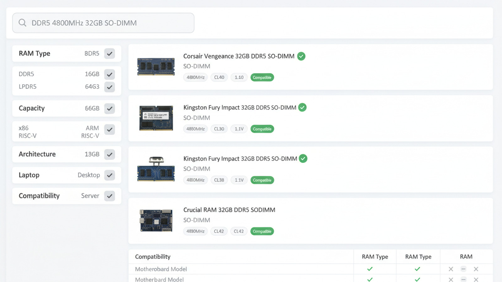 Buyers search for exact specs like "DDR5 4800MHz 32GB SO-DIMM", not product names or generic terms.